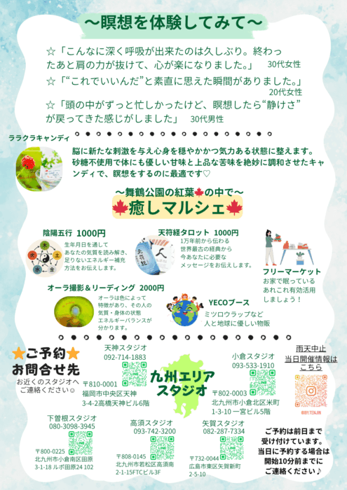 持ち物:ヨガマット(レジャーシート、バスタオル)動きやすい服装、体温調整できる上着、飲み物