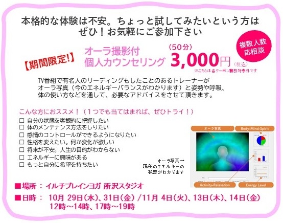 体験レッスンイベント体験レッスン+オーラ撮影オーラ撮影問合せ ※ 入会予約はこちらからお申し込みください