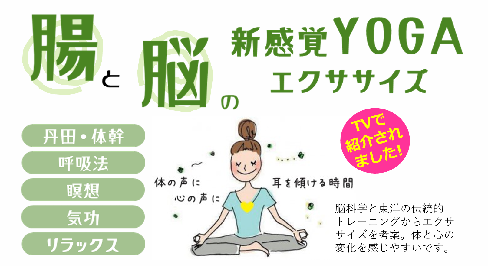 脳科学と東洋医学から考案された、丹田強化エクササイズ、瞑想、呼吸法で、脳と腸にアプローチ。