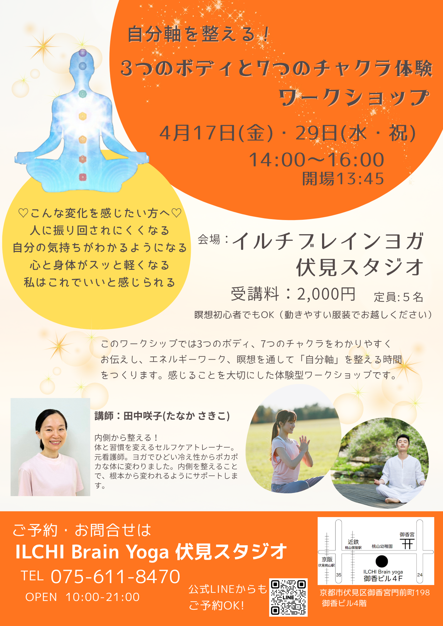 【伏見】4月17日(金)29日(水・祝) 自分軸を整える!3つのボディと7つのチャクラ体験ワークショップ 4月 17日 2:00 PM - 4月 29日 4:00 PM イルチブレインヨガ伏見スタジオ 伏見区御香宮門前町198 御香ビル 4階 京都市 京都府 日本 最近こんなことありませんか? ✔ 頑張っているのに満たされな ...