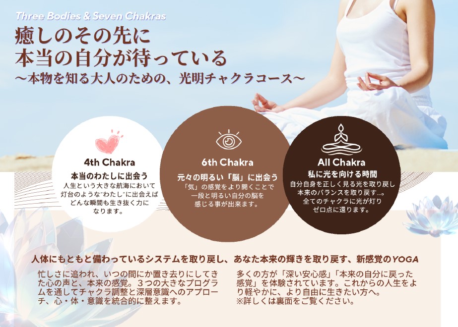 【修学院】4月10日(金)12日(日)17日(金) 25日(土)3ボディ&7チャクラ を感じるワークショップ